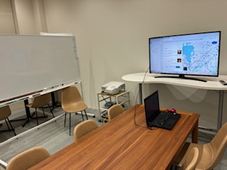 会場(ホワイトボードの奥の大きなモニターと机といすがあるところ